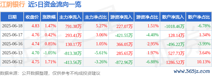 本站消息添盈聚富,截至2025年6月18日收盘,江阴银行(002807)报收于4.83元,上涨1.47%,换手率1.28%,成交量31.36万手,成交额1.5亿元。