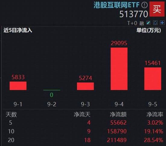 近期,港股互联网ETF(513770)已获得资金密集涌入,博弈补涨行情。上交所数据显示,其上周累计获资金净流入5.57亿元,近20日资金累计增仓逾21亿元。
