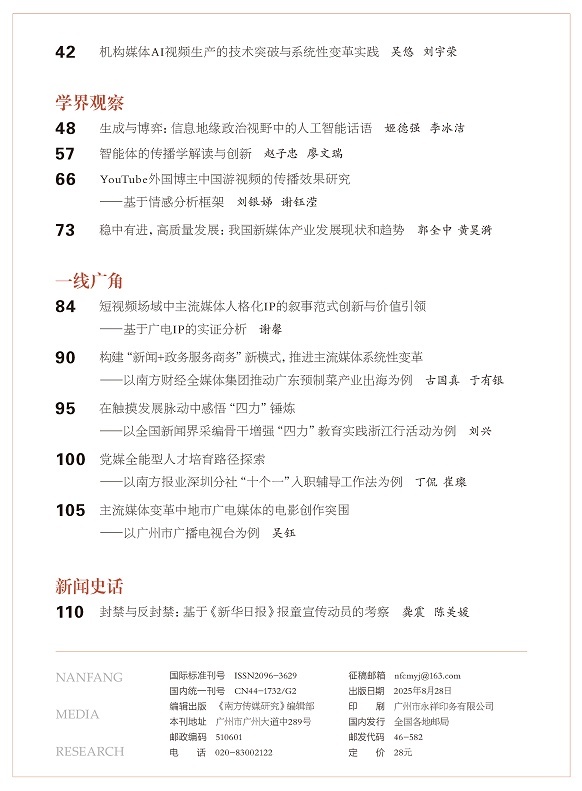 本研究通过对YouTube平台外国博主中国游视频的观众评论进行定量与定性相结合的分析,揭示了“China Travel”热点背后的中国游视频的讨论主题、情感体验和国际传播效果。研究结果表明,视频评论的讨论主题多元,情感倾向以正面积极的情感为主,基于话题讨论的正面情感体验卷入促进了观众的认知重构,高互动的评论往往通过情感共鸣和话语博弈激发视频传播潜力。总体而言,外国博主的中国游视频在国际传播中展现出较强的影响力,不仅转变了外国观众对中国的认知,也在情感共鸣与互动讨论中增强了传播效果。